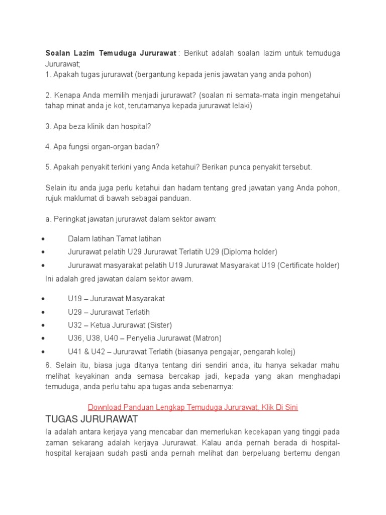 Panduan dan Contoh Soalan Temuduga Jururawat 2021. Soalan Temuduga Jururawat Pelatih U29 Share. Adik2 yang mungkin first time nak temudugamasih tetanya-tanya apa soalan yang selalu ditanya dan macam mana nak kurangkan rasa nervous yang macam nak tercabut jantung bila masuk bilik temuduga HAHAHAHOk.
